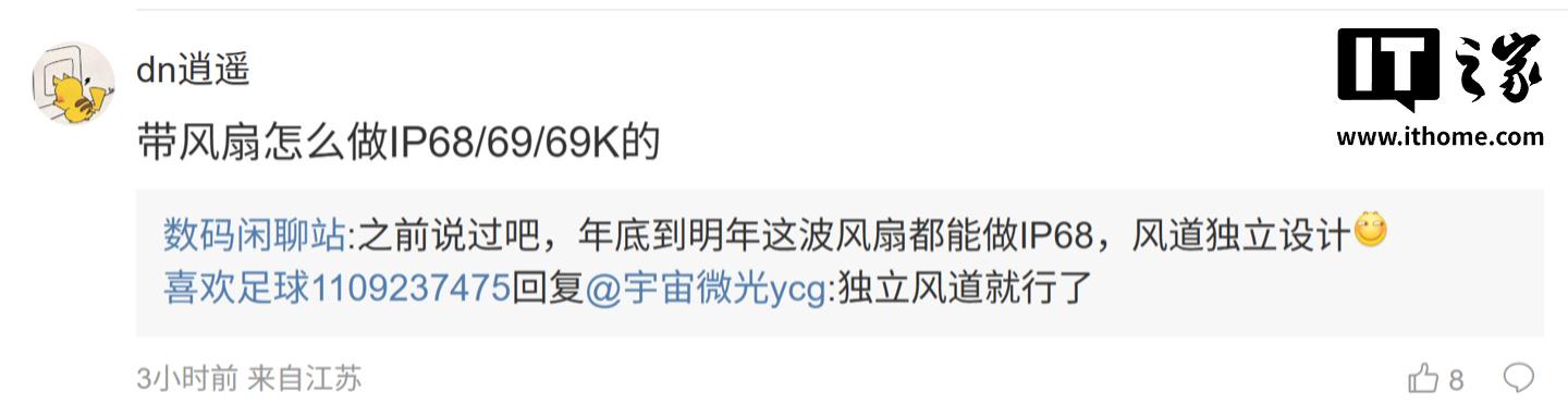 后续由用户在批驳区磋商:“带电扇怎样作念 IP68/69/69K 的”,博主恢复说念:“之前说过吧,年底到来岁这波电扇齐能作念 IP68,风说念孤苦缠绵 [滑稽]”;另又名用户则线路:“站宝,提倡他们低廉少许,思整一个 win [狗头斜眼] 宽广电板加 8E5 思思齐爽 [狗头斜眼]”,博主恢复说念:“些许钱合乎 [狗头斜眼]”。